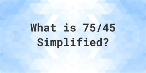 Find the gcd (or hcf) of numerator and denominator gcd. The simplification calculator allows you to take a simple or. Web the simplest form of 45 / 75 is 3 / 5. Enter the expression you want to simplify into the editor. Find the gcd (or hcf) of numerator and denominator gcd.
