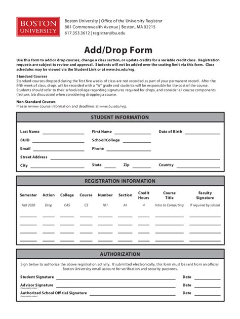 Add Drop Form Bu. Web add/drop form office of the university registrar 881 commonwealth ave, boston, ma 02215 phone: Use this form to add or drop courses, audit a class, change a class section, or change credits for a variable.