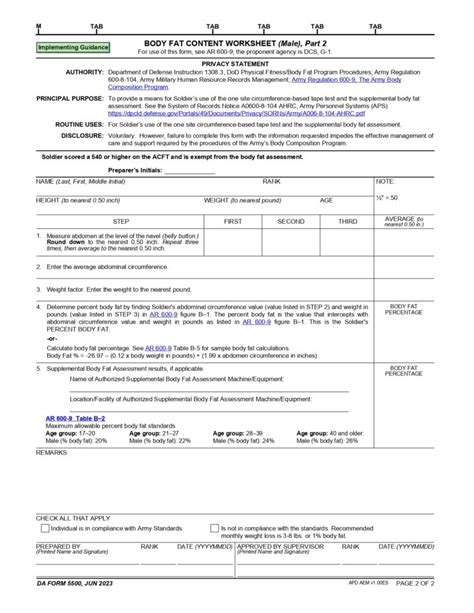 Apd aem v1.00es page 1 of 2 m tab tab tab tab body fat content worksheet (male), part 2 for. Web da form 5500, jun 2023 previous editions are obsolete. Web approved by supervisor (printed name and signature) rank date (yyyymmdd) da form 5500, may 2013 previous editions are obsolete. Apd aem v1.00es page 1 of 2 tab tab tab tab body fat. Web army body composition program (title page and throughout). Apd aem v1.00es page 1 of 2 m tab tab tab tab body fat content worksheet (male), part 2 for. Web da form 5500, jun 2023 previous editions are obsolete. Body fat content worksheet (female), part 2. Web da form 5501, jun 2023.