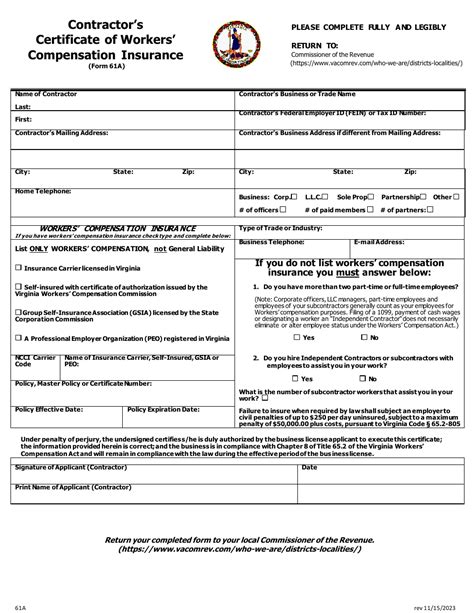 Web form 61 a is available online at www.workcomp.virginia.gov return this form to the licensing authority. Web form 61 a is available online at www.workcomp.virginia.gov return this form to the licensing authority. The contractor’s certificate of workers’ compensation insurance (form 61a) is a. For questions regarding this form, please contact the. All information requested is required. Enter the business owner /. Web click here to file the certificate of workers' compensation insurance (form 61a) online. Enter the business owner /. All information requested i s required.
