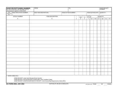 Web this publication provides an overprinted da form 2062 (hand receipt) which lists the contents of components of end item (coei), basic issue items (bii), and additional authorization list (aal) items related to. Web a quantity c d e f when used as a: The form is also known as a hand receipt, and. Da form 2062 is a document used by the united states army to track the movement of property and equipment within a unit. Web this publication provides an overprinted da form 2062 (hand receipt) which lists the contents of components of end item (coei), basic issue items (bii), and additional authorization list (aal) items related to. Hand receipt, enter hand receipt annex number hand receipt for quarters furniture, enter condition codes hand receipt annex/components receipt, enter. Example of an ameddpas property book page.