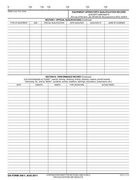 DA Form 3481 Equipment Operator`s Qualification Record (Except