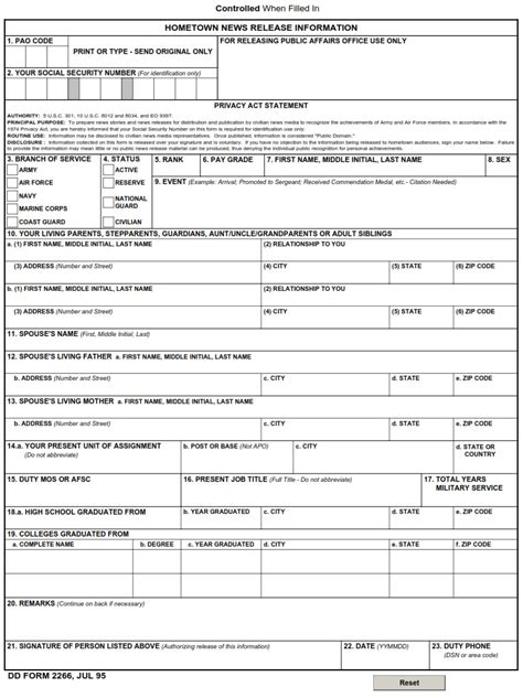 Web dd form 2266, also known as the hometown news release information, is an important form for those in the united states military. Web ocs hall of fame 2022 rsvp to 2022 ocs hall of fame dinner hometown release dd form 2266 8012 and 8034, and eo 9397. Web the proper recourse is to either remove files that are aleady attached to make room for new ones, or resize images before uploading them. Web dd form 2266, also known as the hometown news release information, is an important form for those in the united states military. Web dd form 2266, jun 95. To prepare news stories and news releases for distribution and publication by civilian news media to recognize the achievements of.