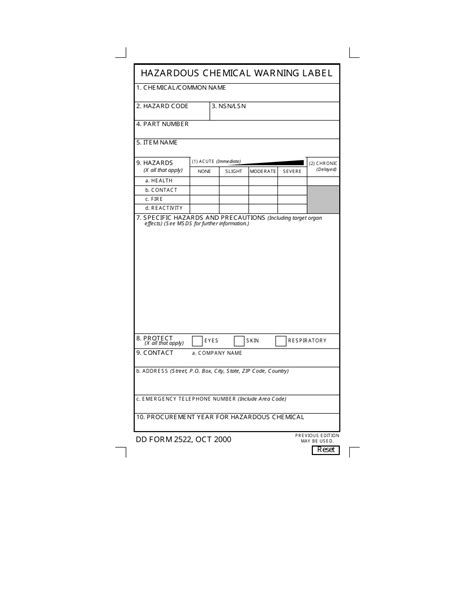 Dd form 2522, hazardous chemical warning label (4 x 6), october 2000 author: Dd form 2522, hazardous chemical warning label (4 x 6), october 2000 author:
