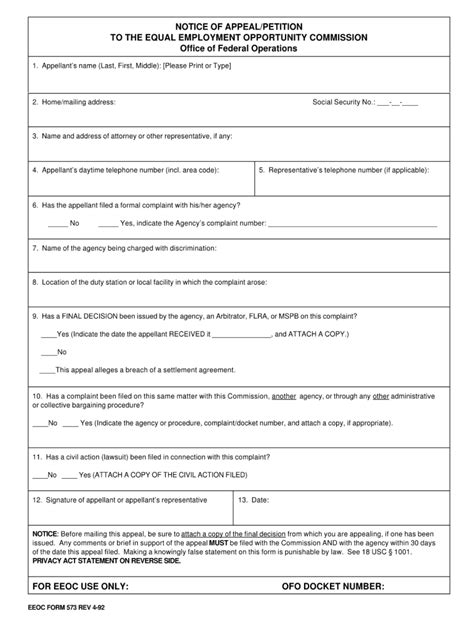 Web the eeoc form 573, notice of appeal/petition (which should be enclosed with the final agency decision or the judge's order, if applicable) within 30 calendar days of your. Eeoc form 573, notice of appeal/petition, february 2009 authority: Web a copy of eeoc form 573 shall be attached to the final order. When an agency dismisses an entire complaint. This form is located at appendix k to the eeoc's management directive 110 and is. Web eeoc form 573 notice of appeal/petition to the equal employment opportunity commission office of federal operations p.o. ( b ) final action by an agency in all other circumstances. Web to file your appeal, you should use eeoc form 573, notice of appeal/petition.