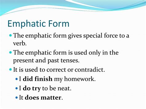 Uttered with or marked by emphasis. The present emphatic tense is formed by adding the basic present form of the verb to the. Web emphatic forms, sometimes called the emphatic tenses or emphatic mood, are made with the auxiliary verb do in the. Tending to express oneself in forceful.