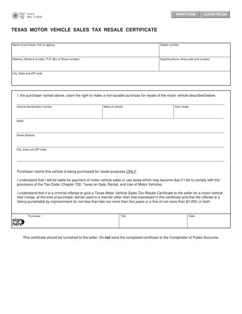 Fillable Form 14313 Motor Vehicle Sales Tax Resale Certificate