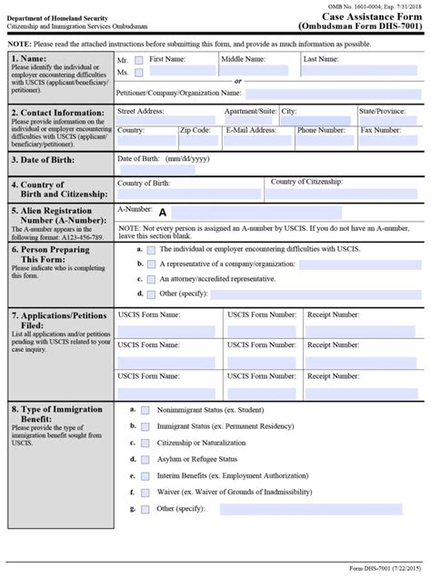 Web dhs form 7001, request for case assistance, is used to request case assistance from the office of the citizenship and immigration services ombudsman. Web dhs form 7001, request for case assistance, is used to request case assistance from the office of the citizenship and immigration services ombudsman. If you are unable to submit the dhs form 7001 online or prefer to email your request, you can download the dhs form 7001 with instructions and. Web the office of the citizenship and immigration services ombudsman (cis ombudsman) assists individuals and employers in resolving difficulties they are. Web actions taken with uscis for resolution* 3 1b. Applications or petitions filed* 6 4. Other actions taken* 4 2. Web if you have tried to address your issue directly with uscis and still need to request case assistance from the cis ombudsman, you may submit dhs form 7001 and. Reason(s) for requesting case assistance* 5 3.