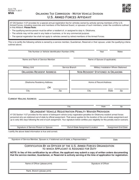 Form 779 Oklahoma. Section 1127 provides for a reduced annual registration fee for vehicles owned by active duty. Armed forces afidavit 47 o.s.