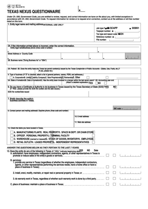 Fillable Form Ap114 Texas Nexus Questionnaire printable pdf download