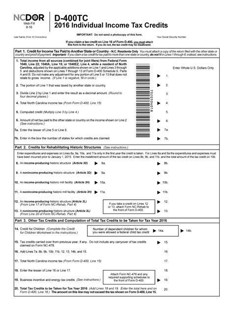 Form D 400Tc. Otherwise, the tax credit may be disallowed. Individual income tax return (no tax.