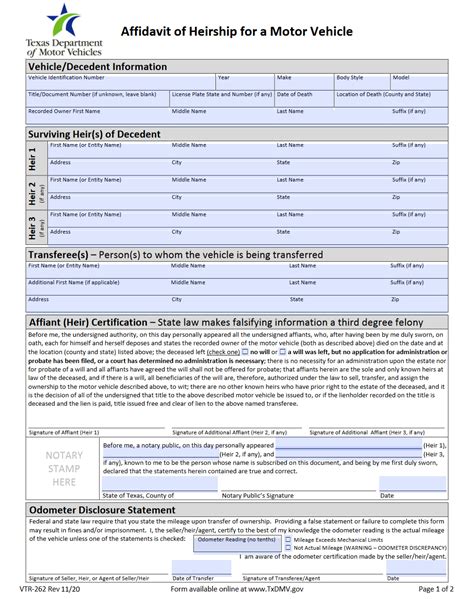A release of lien (if applicable); A title and registration verification or current license receipt; Application for texas title and/or registration (form. If there is more than one heir, each of you must sign the form and have the signatures notarized. Heirs may fill out individual affidavits of heirship and must have each.