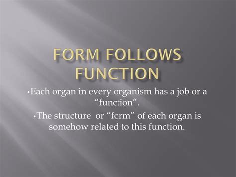 Function Follows Form Anatomy. A body part can perform its function only if it is a certain shape, or.