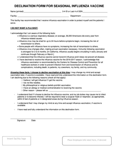 Influenza Declination Form. Web declination of influenza vaccination. Form for healthcare worker signature and date, lists important reasons for annual influenza vaccination and.