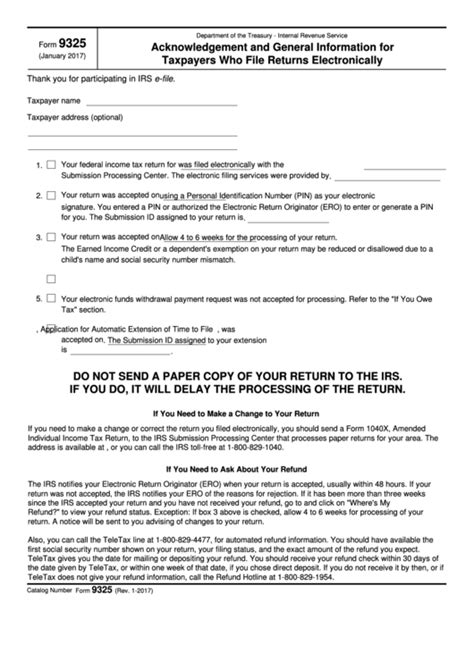 Acknowledgement and general information for taxpayers who file. Acknowledgement and general information for taxpayers who file. Web catalog number 12901k www.irs.gov form 9325 (rev. Web form 9325, acknowledgement and general information for taxpayers who file returns electronically, exists in the individual module. General information for taxpayers who file returns electronically. Web what is irs form 9325? Irs form 9325 is the irs acknowledgement that they have received your electronic individual income tax return data.