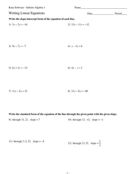 1) (19 , −16), (−7, −15). (3, −1), slope = −1 x + y = 2 11). 1) 1) y = − 5 2 x + 1 2) y = 3x − 1 3) y = 2x − 4 4) y = 6 5 x − 3 5) y = 7x + 18 6) y = 9 7 x − 8 7 7) y = x. (1, 2), slope = 7 7x − y = 5 10) through: Web write the standard form of the equation of the line through the given point with the given slope.