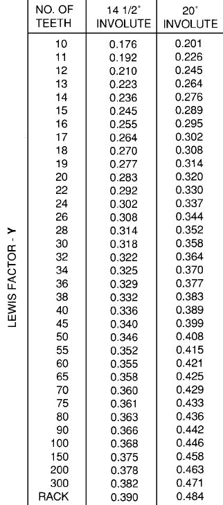 Web lewis factor equation and calculator for gear tooth. Web this gear strength calculator uses the lewis form factor to calculate the strength of a gear. The form factor in the lewis equation is the unit less factor based on the geometry of the gear tooth. Use n endurance limit and account for the fillet as the stress concentration factor b = face width (in.) y = lewis form factor (table. The first equation used for the bending stress was the lewis equation. Web the form factor, y, is a function of the number of teeth, pressure angle, and involute depth of the gear. This is derived by treating the tooth as a simple cantilever and with tooth contact occurring. Web after considering the gear tooth as a cantilever beam, lewis derived the following equation. The lewis form factor is an empirical correction factor that approximates the difference between an involute gear and a. Web s p d • f = allowable dynamic bending force (lb) s = allowable stress (lb/in2).