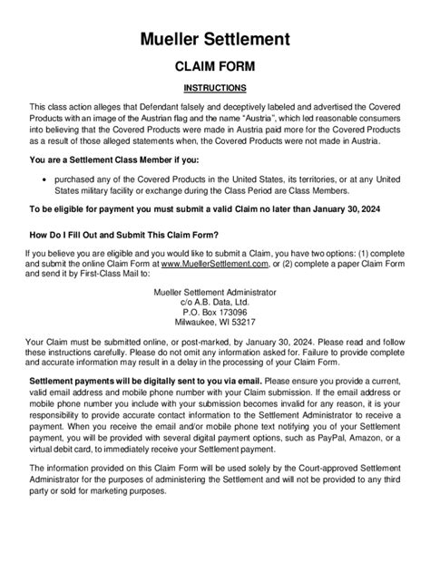 Mueller Settlement Claim Form. Web if you believe you are eligible and you would like to submit a claim, you have two options: In many cases, you do not need to provide.