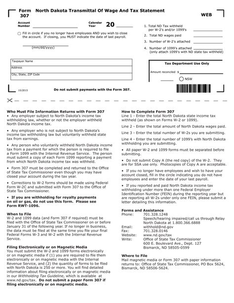 Nd Form 307. 10/2015 do not submit payments with form 307. Web we last updated the north dakota transmittal of wage and tax statement in january 2023, so this is the latest version of form 307, fully updated for tax year 2022.