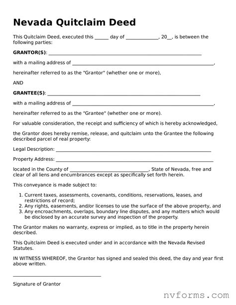 Download the nevada quit claim deed to transfer property to a family member, close friend, or similar party. To have and to hold, all and singular the described property, together with the tenements, hereditaments, and appurtenances belonging, or in anywise. Web create a high quality document now! A nevada quitclaim deed is a simple form to modify property ownership, adding or removing a name, without guarantees of clear title. Deed in lieu of foreclosure. A nevada quit claim deed is a legal form that allows a person,. Web nevada quit claim deed form.