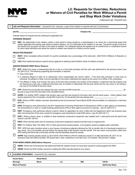 Nyc Dob L2 Form. This form must be completed by the owner, or authorized designee, of the subject premises in order. Requests for overrides, reductions or waivers of civil penalties for work without a permit and stop work order violations.