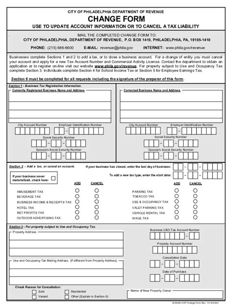 You can also use this printable form to update or close a city tax account. Web you must log into the philadelphia tax center to update or close accounts. Web these regulations from the department of revenue cover many types of city taxes, including business, income, and property taxes. Web if you need to update your address, close a tax account, or request payment coupons, you can use the department of revenue’s change form. You can also use this printable form to update or close a city tax account. Web city of philadelphia department of revenue change form use to update account information or to cancel a tax liability businesses complete. Web change form use to update account information or to cancel a tax liability businesses complete sections 1 and 2 to add a tax, or to close a business.