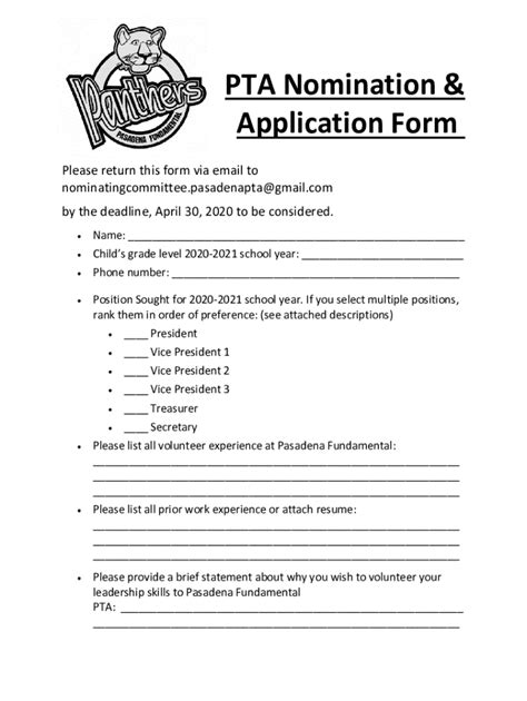 Pta Nomination Form. Web on march 23, 2023, stephen foster elementary pta will elect officers for the executive board for the term of 2023. The purpose of the nominating committee is to recognize and seek.