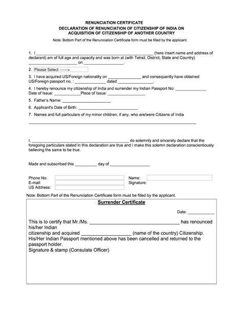 Renunciation Certificate Form. Has renounced his / her indian citizenship and acquired united states citizenship. Oath/affirmation of renunciation of nationality of.