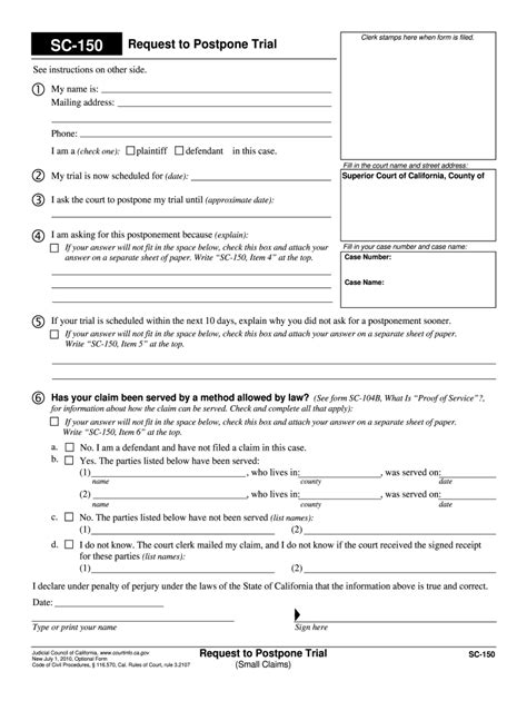 Sc 150 Form. Web ask the small claims judge if you can move your hearing to a later date. Write a letter to the court explaining why you need to.