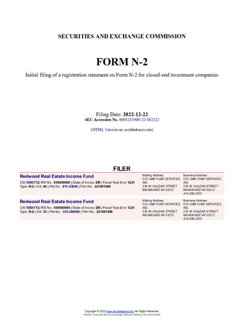 Sec Form N-2. You may not send a completed printout of this form to the sec to satisfy a filing obligation. Investment company act of 1940,.