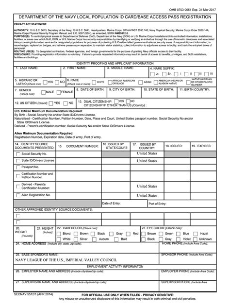 Secnav Form 5512. Department of the navy local population id card/base access pass registration.