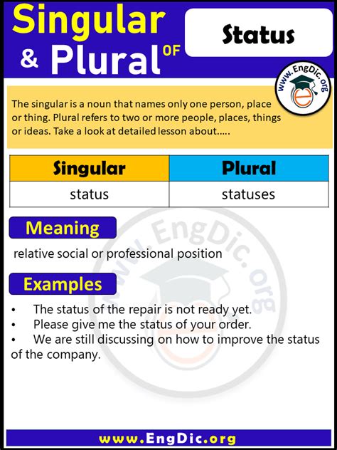 Status Plural Form. Position or rank in relation to others the status of a father b : Web as others have mentioned, there are several possible plural forms of status.