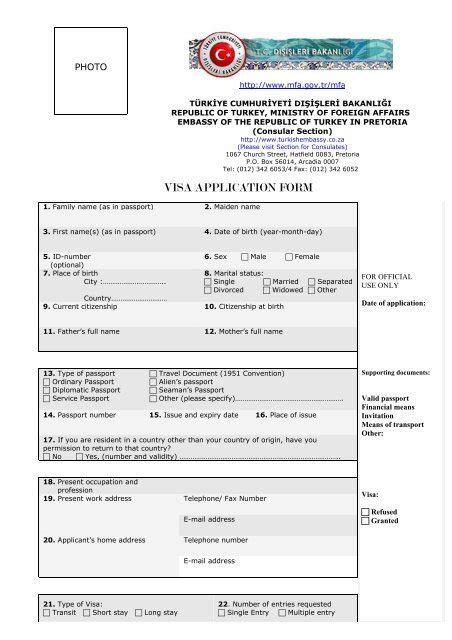 Turkey Visit Visa Application Form. Family name (as in passport) 2. Web republic of turkey, ministry of foreign affairs visa application form 1.