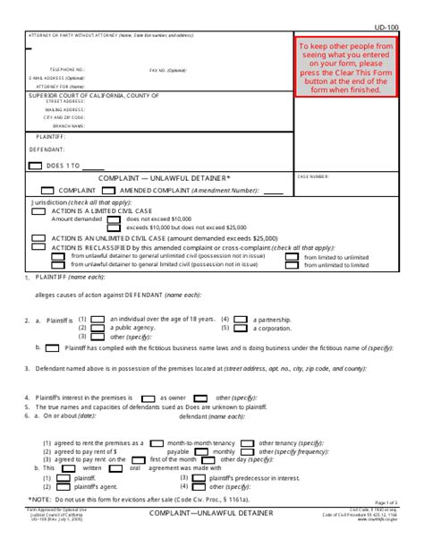 UD100 Complaint Unlawful Detainer Free Download