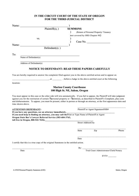 Summons (Return Of Personal Property/tenancy Not Covered By Ors Chapter