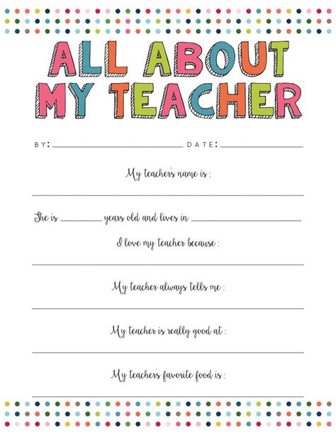 Web this printable all about my teacher includes plenty of space for kids to write their names, the date, draw their teacher, and write. Web printable worksheets & activities for teachers, parents, and homeschool families. Web check out our all about the teacher printable selection for the very best in unique or custom, handmade pieces from our shops. Web grab this all about my teacher printable and learn what gifts you can give to show those teachers some love! You make a positive impact. Math, reading, writing, science, social. Web 0\ whdfkhu v qdph lv bbbbbbbbbbbbbbbbbbbbbbbbbbbbbbbbbbb 0\ whdfkhu uhdoo\ olnhv. Web these fun printable all about teacher surveys are sure to make an impression when your little ones pass. Web check out our all about teacher printable selection for the very best in unique or custom, handmade pieces from our. Customize a worksheet and have your class fill them out.