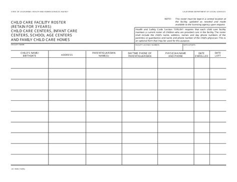 Lic 9040 Roster. The licensee shall ensure that a current register of all clients/residents in the facility is maintained. Child care facility roster (retain for 3 years) child care centers, infant care centers, school age centers and.