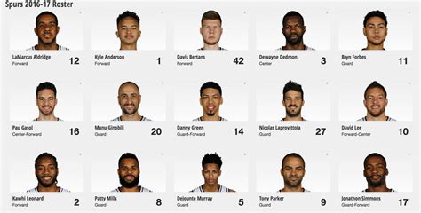 Spurs 2016 Roster. On july 11, tim duncan announced his retirement from the. [1] kawhi leonard was selected to play in the.