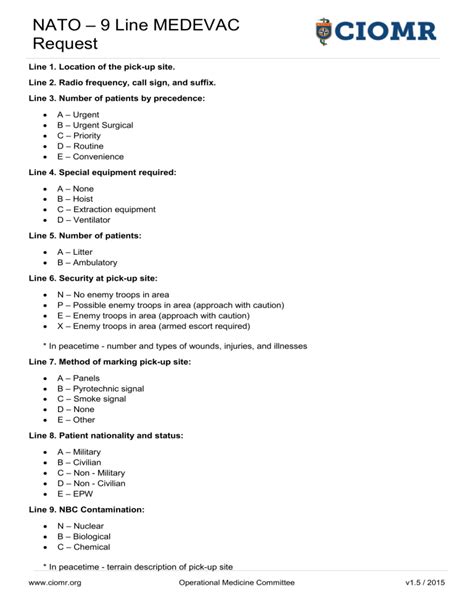 Obtain radio frequency, call sign, and suffix. (command policy will dictate local or zulu time). Reporting activity (uic / unit designation). Web a 9 line medevac is a standard collection of codes that every marine, military officer, helicopter and medical personnel (everyone at the shock trauma platoon (stp) and forward resuscitation. Conduct care under fire and tccc (tactical combat casualty care) step 2: Obtain radio frequency, call sign, and suffix. Contact medevac channel step 4: Collect all applicable information needed for medevac request. Determine the number of patients by type of step 3: Determine the grid coordinates for the pickup site. Obtain the number of patients.