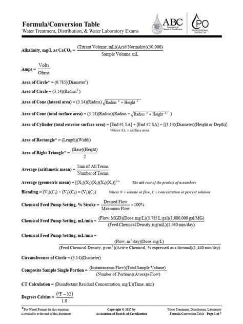 Web abc & c2ep formula/conversion table for water treatment, distribution, & laboratory exams (titrant volume, ml) (acid normality) (50,000) alkalinity, as mg caco3/l = sample volume, ml volts amps = ohms *area of. These tables contain mathematical formulas and define. Wpi/abc standardized exams include a formula/conversion table to assist examinees. Area of circle = (0.785) (diameter2) or (π). Web study materials to help you succeed. Web abc & c2ep formula/conversion table for water treatment, distribution, & laboratory exams (titrant volume, ml) (acid normality) (50,000) alkalinity, as mg caco3/l = sample volume, ml volts amps = ohms *area of. Web abc formula/conversion table for plant maintenance exams. Web abc formula/conversion table for wastewater treatment, industrial, collection and laboratory exams (titrant volume, ml) (acid normality) (50,000) alkalinity, as mg caco3/l = sample volume, ml volts. Web abc & c2ep formula/conversion table for wastewater treatment, industrial, collection, & laboratory exams (titrant volume, ml) (acid normality) (50,000) alkalinity, as mg caco3/l = sample volume, ml volts.