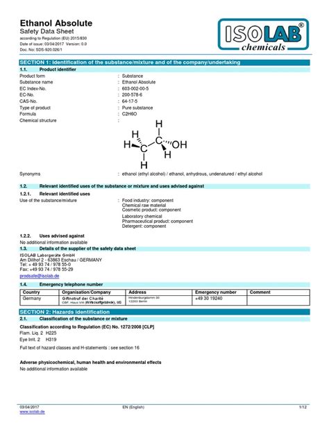 Web view or download the ethanol absolute msds (material safety data sheet) or sds for 107017 from merck. Identification ethanol, 200 proof ac615090000;