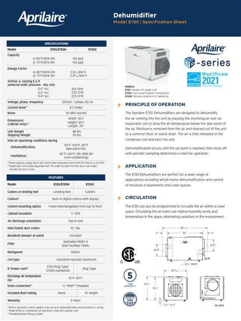 Aprilaire E130 Spec Sheet. Web model e130 | specification sheet specifications rated capacity, energy factor and current draw measured at.