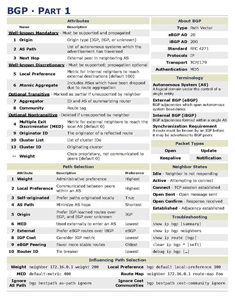 Bgp Attributes Cheat Sheet. Ebgp peering (oldest) router id (lowest) cluster list (minimum) neighbor. January 31, 2022 border gateway protocol ( bgp) is the routing protocol of the internet, used to exchange routing and reachability information among.