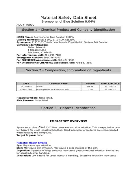 Bromophenol Blue Safety Data Sheet. Bromophenol blue product number : Identification bromophenol blue, sodium salt ac151350000;