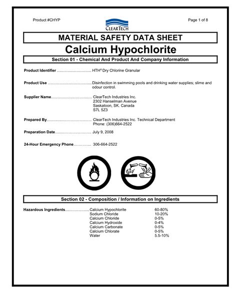 MATERIAL SAFETY DATA SHEET Calcium Hypochlorite Section 01 Chemical