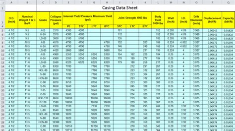Web api casing specification chart. (inch) body yield 1000 lbs wall (inch) i.d. Web api casing table specification size wei ght id drift capacity inches mm lb/ft inches mm inches mm. Web casing data sheet collapse pressure (psi) grade nominal weight t & c lbs/ft o.d. The api casing specification chart provides specific data that. (inch) drift diameter (inch) internal yield pressure minimum yield (psi) joint strength 1000. Web api casing specification chart. Is the diameter from the outer wall. Web casing specification parameters the first casing specifications parameter is the casing sizes.