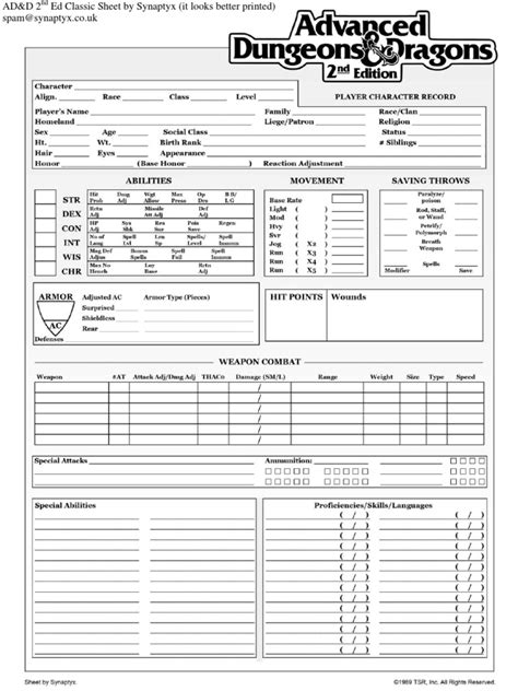 AD&D 2nd edition character sheet by Synaptyx Ficha rpg, Ficha de