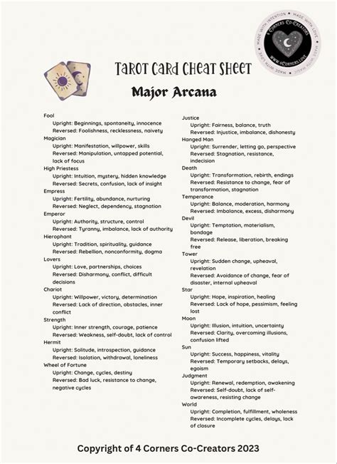Tarot Card Cheat Sheet with Major Arcana Guide Rachel Anne Williams