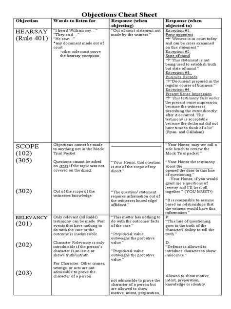 Court Objections Cheat Sheet. (1) objections to the form of the question and (2) objections to testimony. Web 403—compound questions the court may exclude relevant evidence if its probative value is substantially outweighed by a danger of one or more of the following: