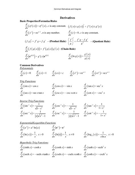 Integral Cheat Sheet Calculus derivative calc trig hyperbolic integral